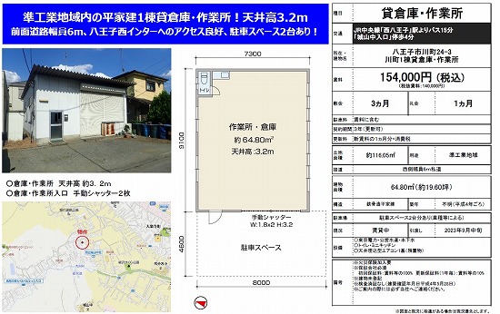 貸倉庫・貸工場の料金相場は広さや地域、設備などによっても大きく変動します。エルネットに登録されている物件から、東京都八王子市の貸倉庫・貸工場の平均坪単価をご紹介します。