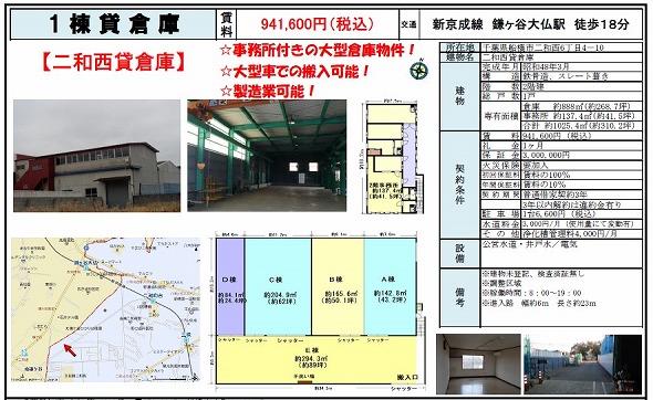 | 所在地 | 千葉県船橋市二和西6丁目4-10 二和西貸倉庫 | ||