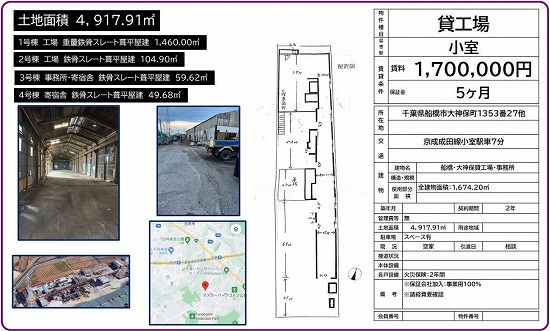 | 所在地 | 千葉県船橋市大神保町1353ー27 船橋・大神保町貸工場 | ||