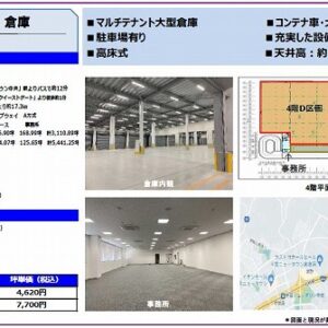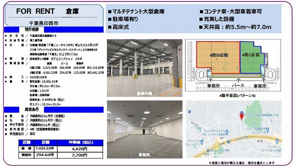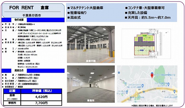 ・5階建/4階部分 ・東関東自動車道 千葉北ICより17.3km/成田空港から26.1km ・自走式スロープにつき平屋使い可能 ・事務所あり ・設備 ドッグレベラー ・付近にコンビニ、スーパー、飲食店あり