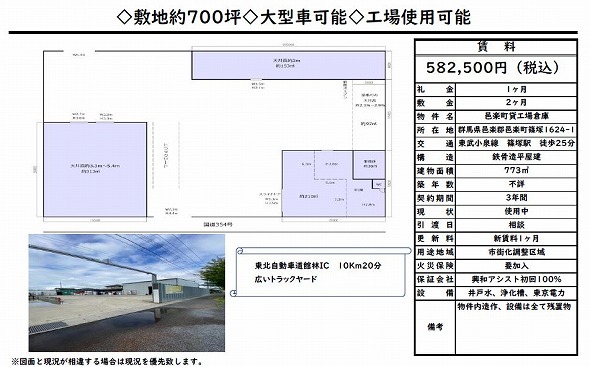 | 物件種別 | 貸倉庫・貸工場 | 建物構造 | |