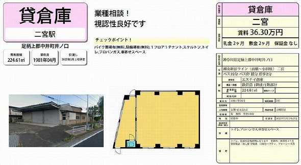 | 所在地 | 神奈川県足柄上郡中井町井ノ口2419-20 エスティ倉庫 | ||