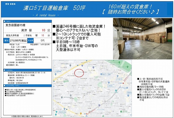 所在地 神奈川県川崎市高津区溝口5丁目13-18 溝口5丁目運輸倉庫