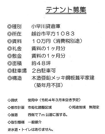 | 所在地 | 埼玉県越谷市大字平方1083 小早川貸倉庫 | ||