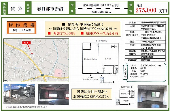 埼玉県春日部市赤沼1329-1 115.3坪 貸倉庫・貸工場|L-Net(エルネット) 画像1 80390-2.jpg 80390-3.jpg 80390-4.jpg