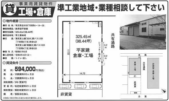 | 物件種別 | 貸倉庫・貸工場 | 建物構造 | |