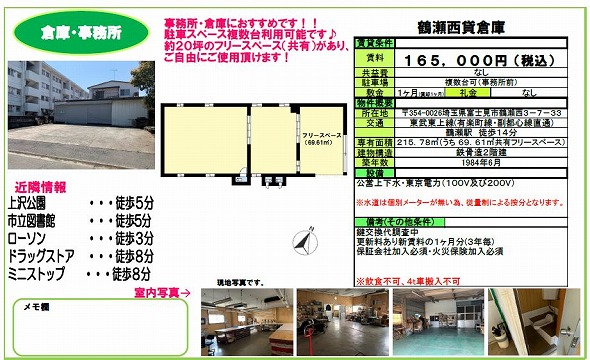 | 所在地 | 埼玉県富士見市鶴瀬西3丁目7-33 鶴瀬西倉庫 | ||