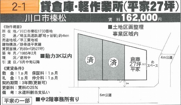 | 物件種別 | 貸倉庫・貸工場 | 建物構造 | 鉄骨造 |