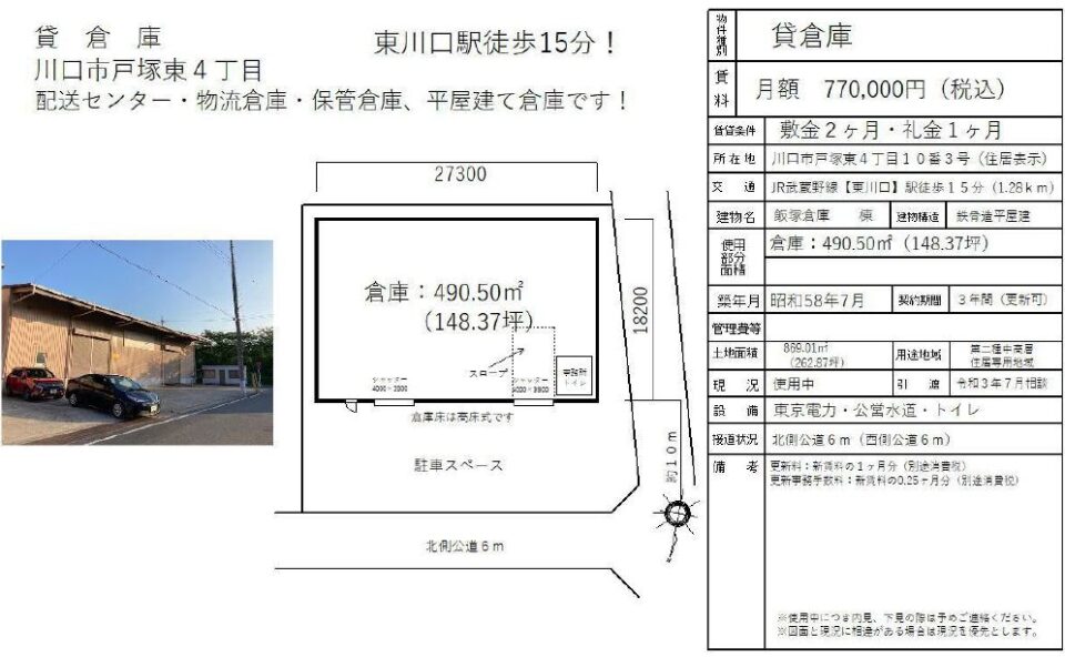 80688.jpg 埼玉県川口市戸塚東4丁目10-3 148.4坪 貸倉庫・貸工場|L-Net(エルネット) 画像2 80688-3.jpg 80688-4.jpg