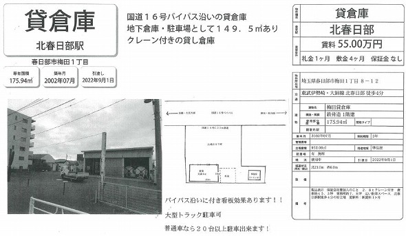 | 所在地 | 埼玉県春日部市梅田1丁目8-12 梅田貸倉庫 | ||