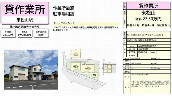 | 所在地 | 埼玉県比企郡吉見町大字南吉見1586-1 南吉見町倉庫作業所 | ||