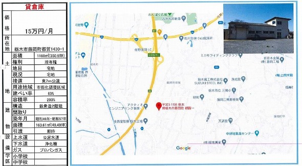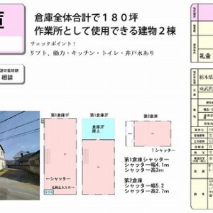 ・東北自動車道 栃木IC近く ・シャッターあり ・設備 トイレ/プロパンガス/エアコン ・付近にガソリンスタンド、郵便局、コンビニ、スーパー、飲食店あり