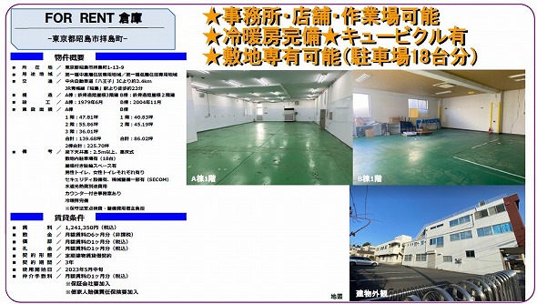 | 物件種別 | 貸倉庫・貸工場 | 建物構造 | |