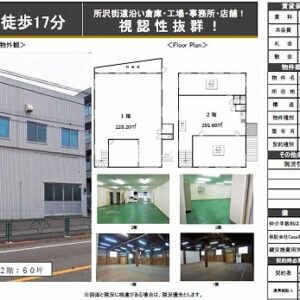・準工業地域 ・関越自動車道 所沢ICより約8.6km/国道4号線近く ・駐車場あり ・大型車進入可能 ・設備 電気/トイレ ・付近にドラッグストア、コンビニ、スーパー、飲食店あり