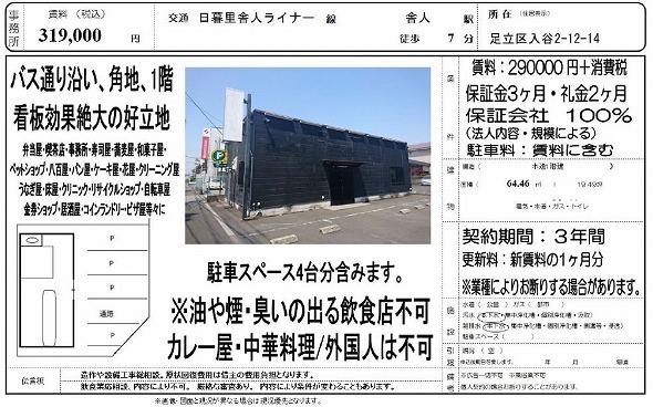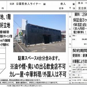 ・フリーレント2ヶ月 ・8階建/1階 ・飲食店可能 ・国道4号線近く ・近隣駐車場(20,000円/月)あり ・シャッターあり ・スケルトン渡し ・土日祝日利用可能 ・設備 都市ガス ・付近にガソリンスタンド、病院、コンビニ、スーパー、飲食店あり