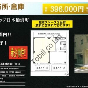 ・首都高速都心環状線/首都高速9号深川線/首都高速6号 清洲橋IC近く ・機械式駐車場(44,000円/月)あり ・6階建/B1階部分 ・動力あり ・天井高2.6m ・24時間/土日祝日利用可能 ・耐震構造(新耐震基準) ・2025/3 トイレ、給湯室リニューアル ・設備 エアコン/光ファイバー/24時間セキュリティ/トイレ(男女別)/EV(2基) ・付近に病院、コンビニ、飲食店あり