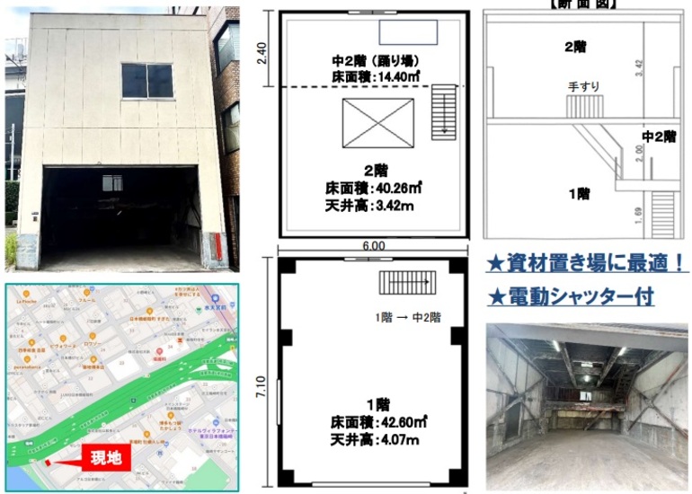 ・3階建/1階 ・首都高速都心環状線近く ・シャッターあり ・付近にコンビニ、スーパー、飲食店あり