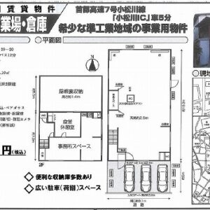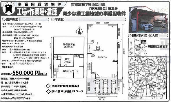 ・首都高速7号 小松川線 小松川ICより約2.3km ・電動シャッターあり ・設備 プロパンガス/変電設備(三相200A69K 単相40A8K) ・付近にコンビニあり