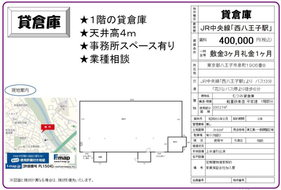 東京都八王子市高倉町 78.3坪 貸倉庫・貸工場|L-Net(エルネット)