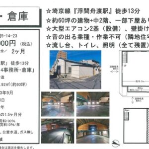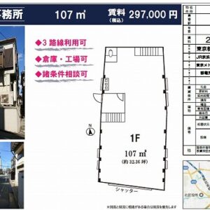 ・2階建/1階 ・首都高速5号池袋線近く ・車寄せスペースあり ・動力引込可能 ・天井高(梁下)約3.6m ・24時間/土日祝日利用可能 ・設備 トイレ(2ヶ所)/流し台 ・付近に病院、ドラッグストア、コンビニ、スーパー、飲食店あり