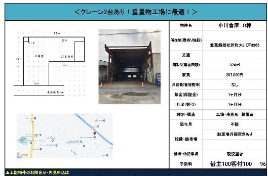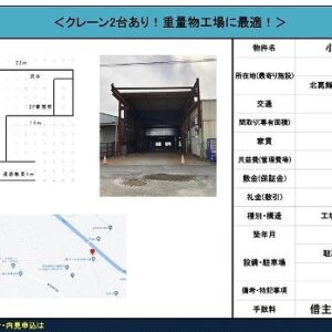 ・駐車場あり ・電動シャッターあり ・フォークリフト(2台)有料譲渡可能 ・事務所(2階建)、休憩室あり ・設備 プロパンガス/給湯/トイレ/東京電力/公営水道/本下水 ・付近に銀行、ドラッグストア、コンビニ、スーパー、飲食店あり