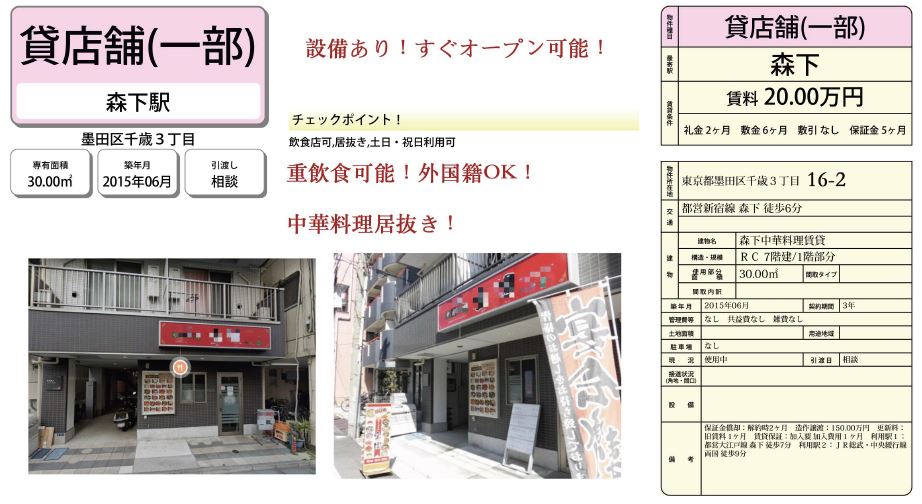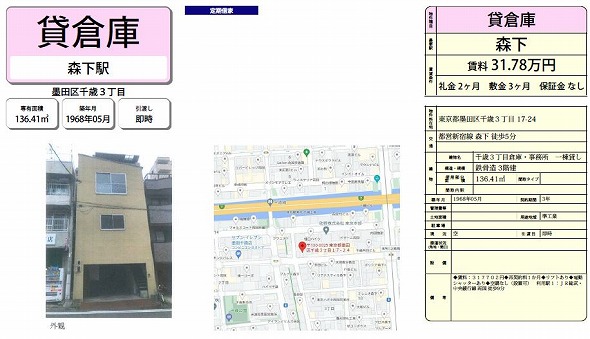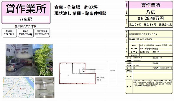 ・飲食店可能 ・首都高速7号小松川線/首都高速6号向島線近く ・電動シャッターあり ・動力電源あり ・事務所あり ・設備 都市ガス ・付近に病院、コンビニ、スーパー、飲食店あり