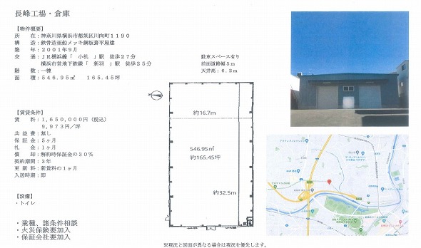 ・2棟一括貸し ・第三京浜道路 港北ICより約800m/緑産業道路近く ・駐車場(10台程度)あり ・シャッターあり ・設備 トイレ/洗面/照明器具 ・付近に郵便局、コンビニ、スーパー、飲食店あり